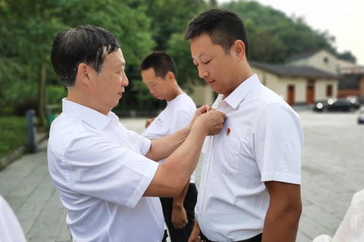 湖北省宜都市紀委監委嚴把黨員入口關,為入黨積極分子、發展對象、預備黨員上好第一堂廉潔課,增強法紀意識和廉潔自律意識。圖為該市五眼泉鎮開展納新黨員集中廉政教育,老黨員現場為新黨員佩戴黨徽、系緊衣扣,引導他們知敬畏、存戒懼、守底線。(湖北省宜都市紀委監委供 劉寧 攝)