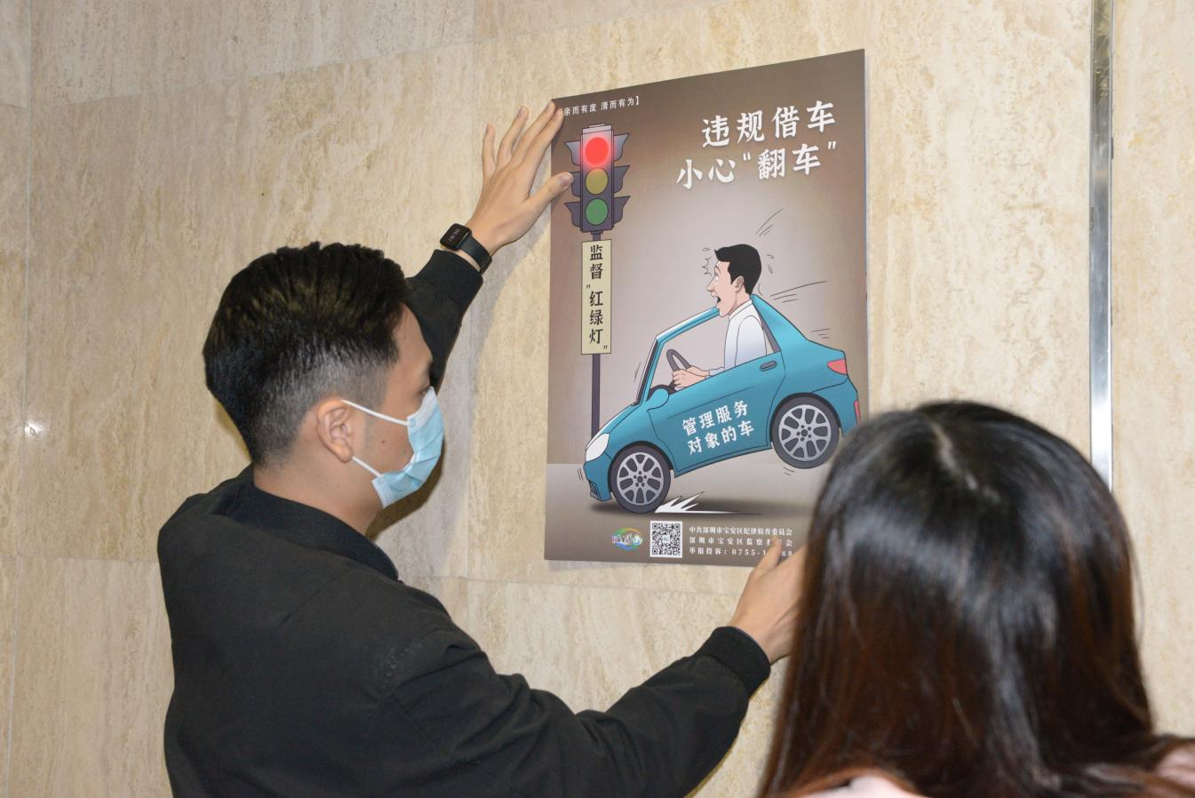 寶安區紀委監委緊盯“四風”問題新表現新動向,聚焦“車輪上的腐敗”開展專項治理,堅持糾“四風”和樹新風并舉,在嚴肅查處的基礎上,加強正面引導和反面警示。圖為該區紀委印發“違規借車 小心翻車”主題海報,提醒黨員干部嚴守紀律規矩,將落實中央八項規定精神轉化為日常習慣和自覺遵循。(蔣增 攝)