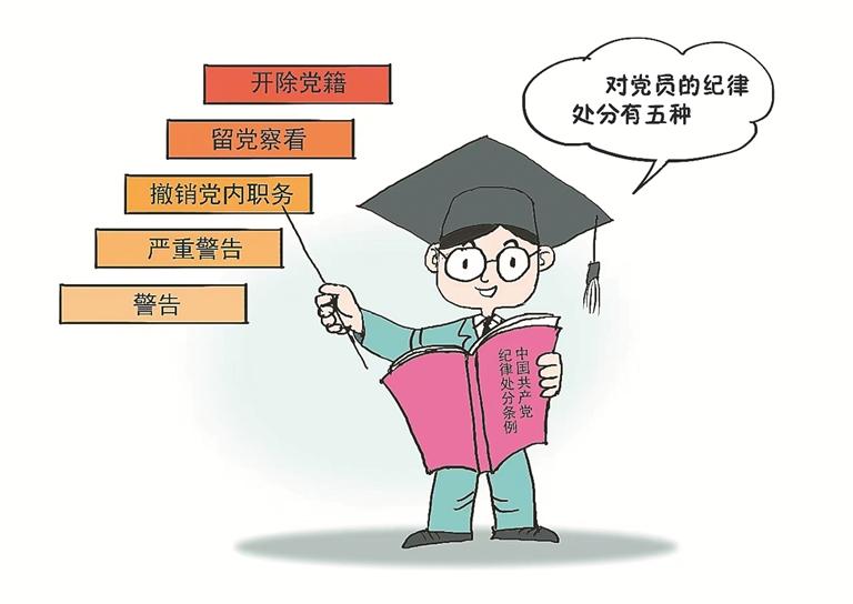 根據《中國共產黨紀律處分條例》第八條規定,對黨員的紀律處分有五種,分別為警告、嚴重警告、撤銷黨內職務、留黨察看和開除黨籍。不同的紀律處分均有相應的影響期,即在一定期限內對受處分黨員擔任黨內外職務的資格等作出限制性規定。