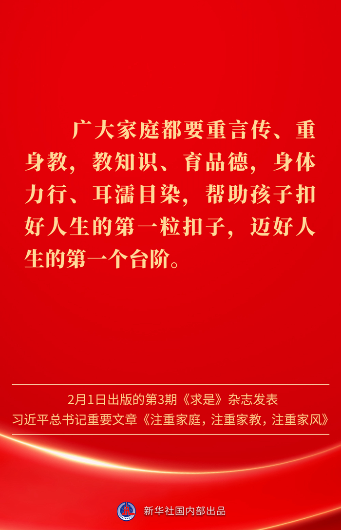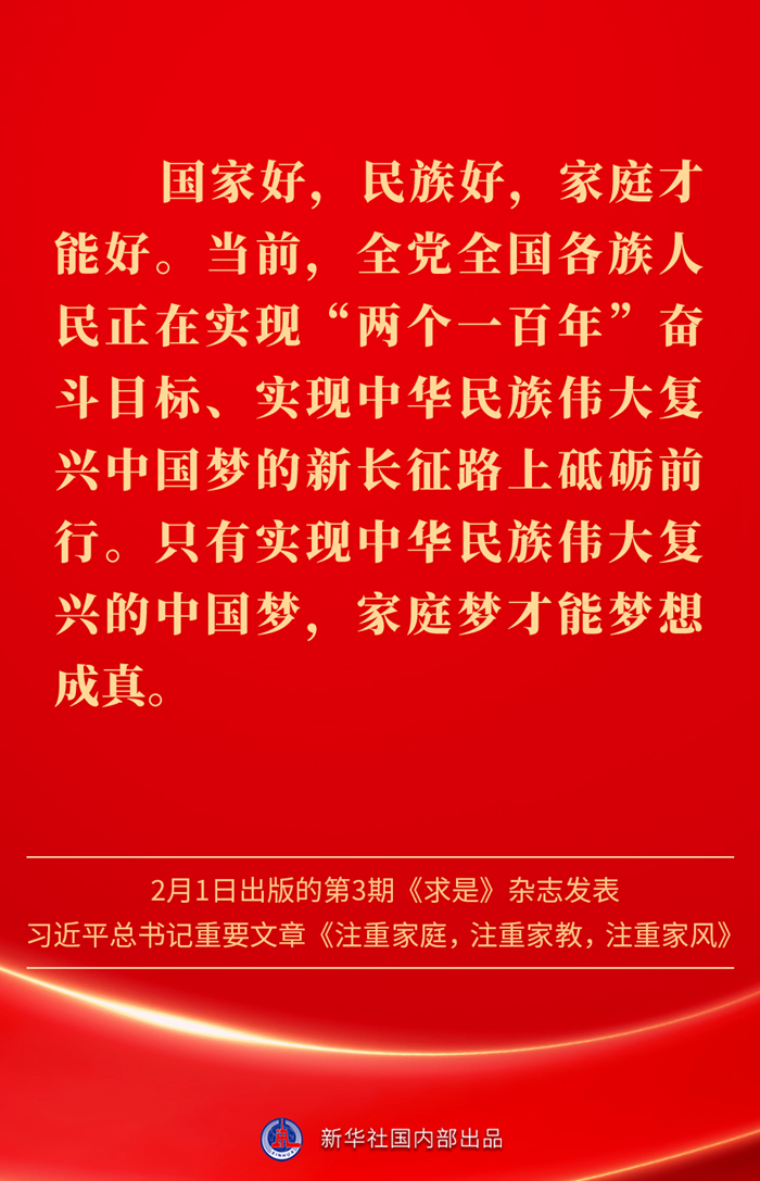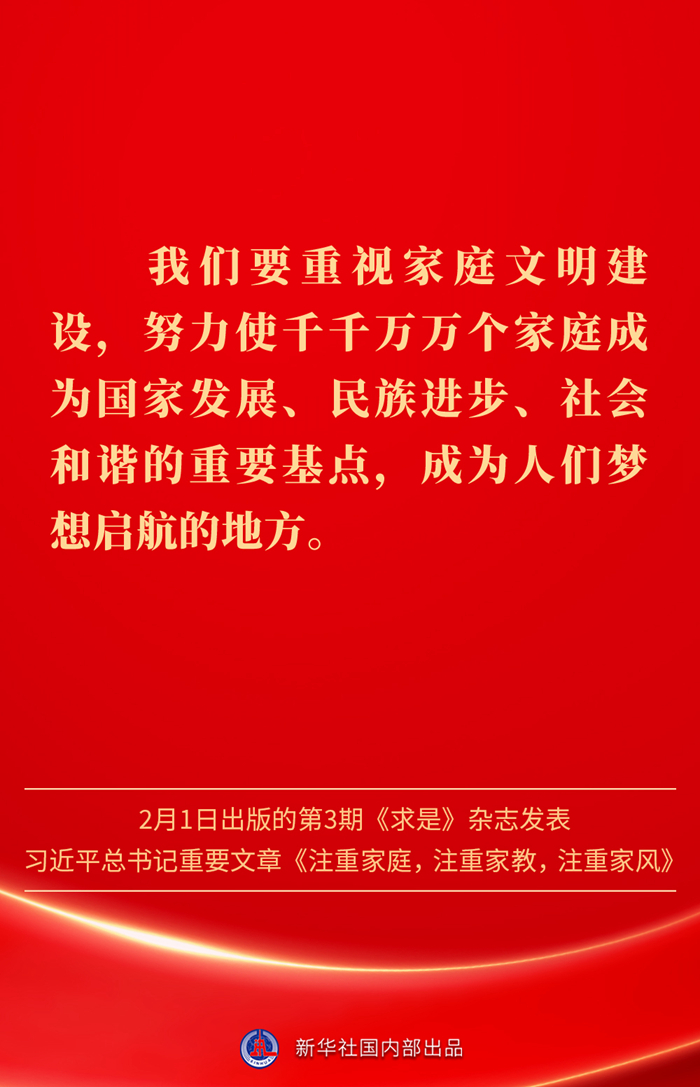 萬家團(tuán)圓共慶新春佳節(jié)之際,2月1日出版的第3期《求是》雜志發(fā)表習(xí)近平總書記重要文章《注重家庭,注重家教,注重家風(fēng)》。為什么要注重家庭、家教、家風(fēng)?如何做好家庭文明建設(shè)?習(xí)近平總書記這樣闡述——