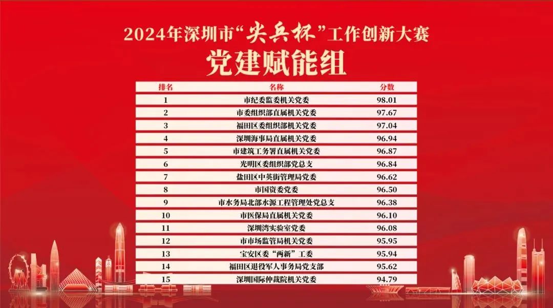9月10日-12日,深圳市直機關(guān)工委舉辦為期3天的深圳市“尖兵杯”工作創(chuàng)新大賽決賽。進入決賽的45個創(chuàng)新案例經(jīng)過綜合展示、現(xiàn)場評分等環(huán)節(jié)的激烈角逐,分別評審出發(fā)展提質(zhì)、正風增效、黨建賦能3個組別的一、二、三等獎。其中,市紀委監(jiān)委機關(guān)黨委《構(gòu)建機關(guān)黨建“1+6+N”工作體系 以高質(zhì)量機關(guān)黨建賦能引領(lǐng)高質(zhì)量發(fā)展》案例獲黨建賦能組一等獎。