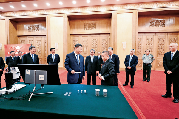 2024年9月23日,黨和國家領導人習近平、李強、趙樂際、王滬寧、蔡奇、丁薛祥、李希等在人民大會堂接見探月工程嫦娥六號任務參研參試人員代表并參觀月球樣品和探月工程成果展覽。這是習近平等參觀月球樣品和探月工程成果展覽。 新華社記者 謝環馳/攝