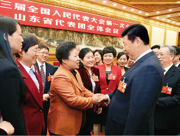2018年3月8日,中共中央總書記、國家主席、中央軍委主席習近平參加十三屆全國人大一次會議山東代表團的審議。在“三八”國際勞動婦女節到來之際,習近平代表黨中央,向參加全國兩會的女代表、女委員、女工作人員,向全國各族各界婦女同胞,致以節日的祝賀和誠摯的祝福。這是習近平同女代表親切交談。 新華社記者 姚大偉/攝