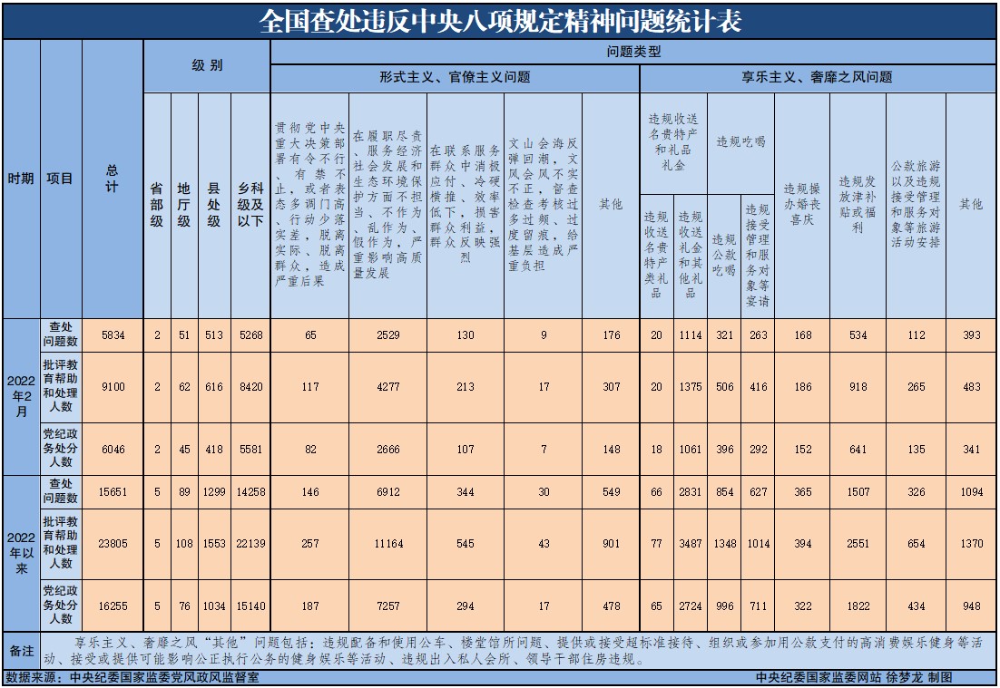 3月27日,中央紀委國家監委公布了2022年2月全國查處違反中央八項規定精神問題匯總情況。當月,全國共查處違反中央八項規定精神問題5834起,批評教育幫助和處理9100人,其中,黨紀政務處分6046人。這是中央紀委國家監委連續第102個月公布月報數據。