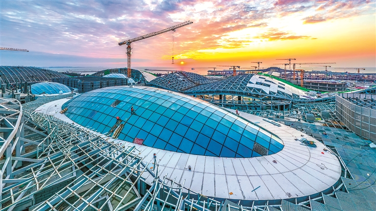 圖為海南自貿港“新地標”??趪H免稅城項目商業中心(地塊五)施工現場,工人正在進行玻璃穹頂施工。 (圖片來源:視覺中國)