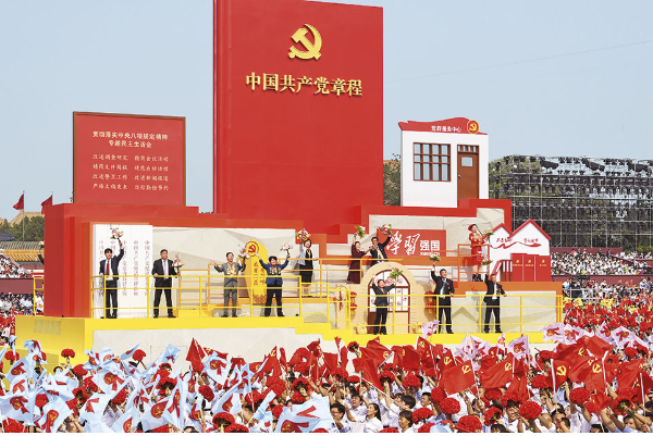 慶祝中華人民共和國成立70周年群眾游行中,“從嚴治黨”方陣彩車上的“中央八項規定精神”元素引人注目。