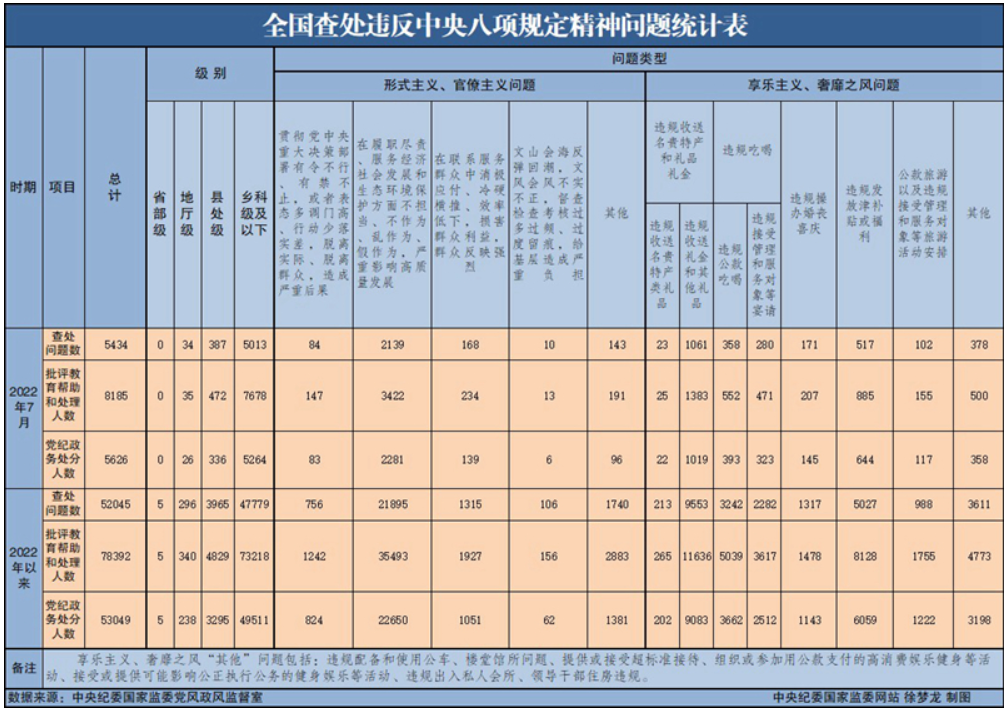 8月28日,中央紀(jì)委國(guó)家監(jiān)委公布了2022年7月全國(guó)查處違反中央八項(xiàng)規(guī)定精神問(wèn)題匯總情況。今年7月,全國(guó)共查處違反中央八項(xiàng)規(guī)定精神問(wèn)題5434起,批評(píng)教育幫助和處理8185人,其中,黨紀(jì)政務(wù)處分5626人,這是連續(xù)第107個(gè)月公布月報(bào)數(shù)據(jù)。