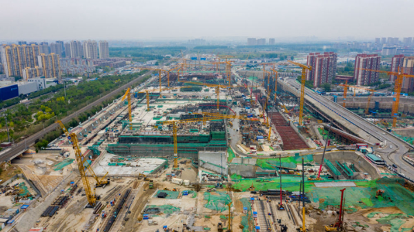 這是在北京市通州區拍攝的建設中的北京城市副中心站綜合交通樞紐(2023年4月23日攝,無人機照片)。新華社發(北京城建集團供圖)