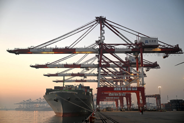 一艘貨輪靠泊在天津港聯盟國際集裝箱碼頭進行裝卸作業(2023年1月1日攝)。新華社記者 趙子碩 攝