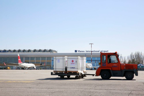 在吉爾吉斯斯坦比什凱克瑪納斯國(guó)際機(jī)場(chǎng),工人轉(zhuǎn)運(yùn)新冠疫苗(2021年3月19日攝)。新華社發(fā)(羅曼攝)