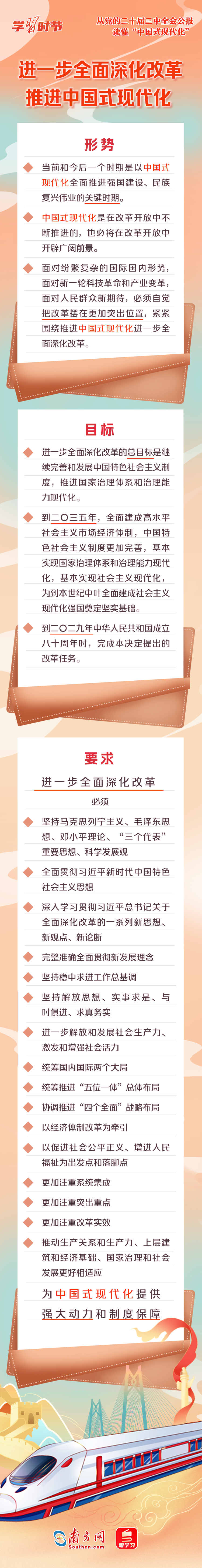 中國式現代化是中國共產黨和中國人民長期實踐探索的成果,是一項偉大而艱巨的事業。全會公報中,“中國式現代化”一詞被反復提及,深刻闡述了進一步全面深化改革與推進中國式現代化的關系,以及中國式現代化的重要保障、必然要求、本質要求等重要內容。一起來學習!